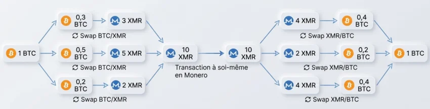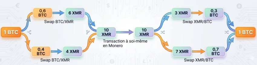 Ce schéma illustre un processus de mixage par swap Bitcoin/Monero conçu pour masquer l’origine des fonds numériques. Le flux commence par la division d’un bitcoin en plusieurs fractions, lesquelles sont immédiatement échangées contre du monero, une cryptomonnaie aux transactions anonymes. Ces actifs sont ensuite regroupés sur une même adresse, puis les moneros sont envoyés vers une autre adresse appartenant au même utilisateur. La transaction de Monero à soi-même (d’un portefeuille auto-hébergé à un autre) constitue une étape essentielle pour brouiller les pistes, car les transactions par « signatures d’anneaux » de Monero sont réputées intraçables. Cela empêche notamment les services de swap de savoir d’où proviennent les fonds. Les moneros sont ensuite redistribués à travers de nouveaux échanges avant d’être reconvertis en bitcoins, puis finalement regroupés sur une même adresse. Cette méthode utilise des swaps (échanges) de devises et des transactions en « signatures d’anneaux » afin de rompre la traçabilité. En combinant ces étapes, l’utilisateur obtient un actif final anonymisé, déconnecté de son historique de transactions initial.
