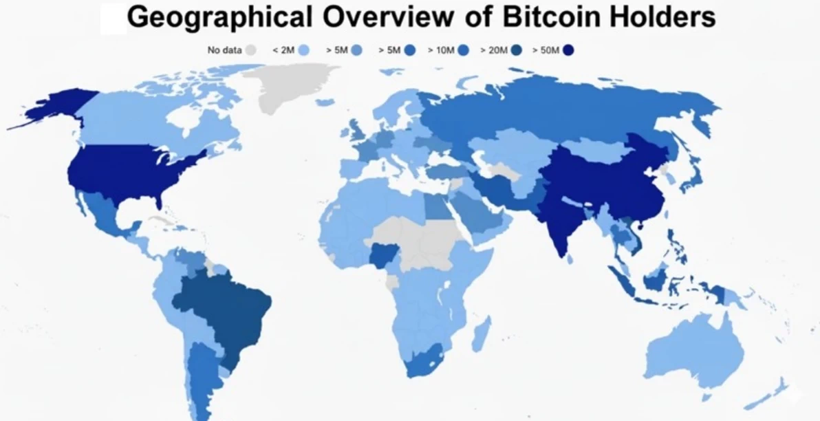 Il est intéressant de savoir où sont les nœuds publics de Bitcoin mais concrètement où sont les « Hodlers » (détenteurs) de bitcoins ? Ci-dessous une carte mondiale du nombre de « Hodlers » Bitcoin [12] :