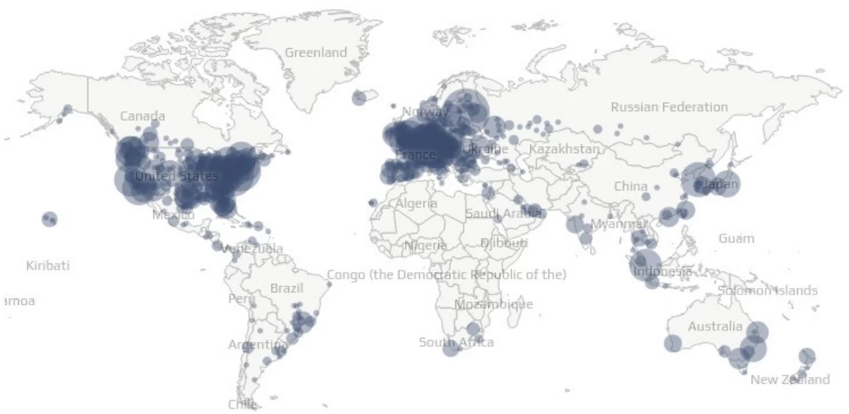 Ci-dessous une carte des nœuds publics de Bitcoin en 2026 [11] :
