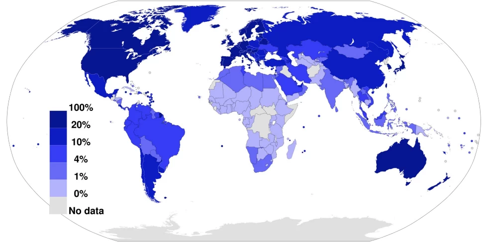 Les plus hauts pourcentages d’utilisateurs d’internet se trouvent en Amérique du Nord, en Europe et en Océanie, puis les seconds se trouvent en Asie et en Amérique du Sud, enfin l’Afrique est le continent avec le moins d’utilisateurs d’internet. D’une manière générale ce sont les pays les plus développés au niveau technologique qui ont le plus d’utilisateurs d’internet.