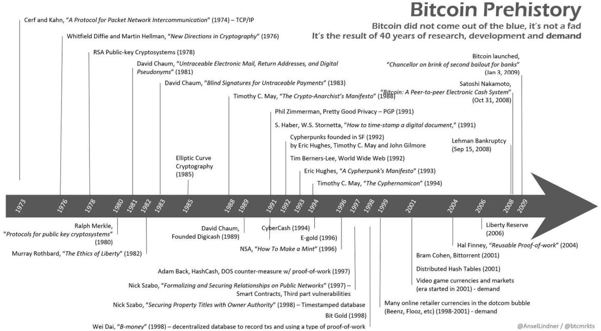 Tout comme internet à sa préhistoire avec ARPANET et la création de TCP/IP, Bitcoin a lui aussi sa préhistoire [8,9] :