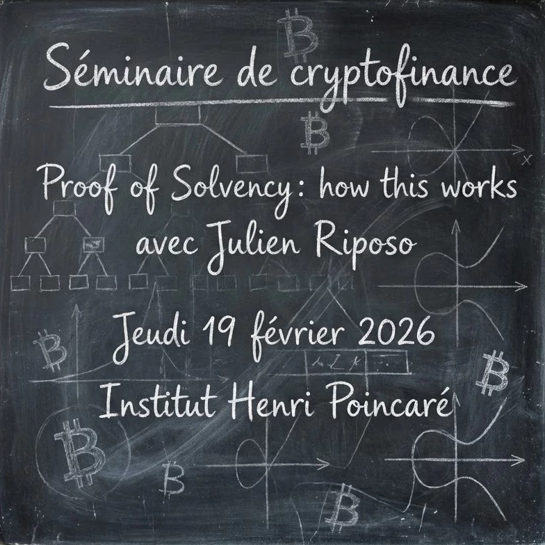 Le prochain séminaire de cryptofinance organisé par Martino Grasselli, Ricardo Pérez-Marco et Cyril Grunspan aura lieu jeudi 19 février 2026 à 17H30 à l’Institut Henri Poincaré (Salle Pierre Grisvard, anciennement salle 314) à Paris.